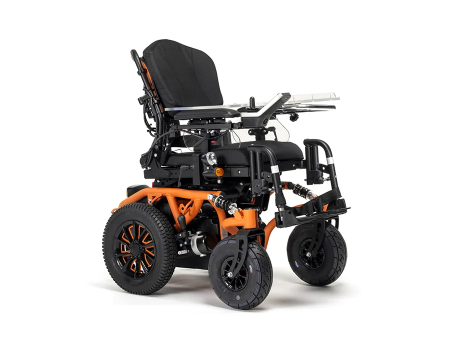 Wózek z napędem elektrycznym dla DZIECI . Fantastyczne rozwiązanie zawieszenia kół tylnych i przednich oparte na amortyzatorach z regulowanym skokiem pozwala czuć najwyższy komfort podczas jazdy w terenie. Prawdziwa frajda podczas jazdy po nierównym terenie. Bardzo interesujące zawieszenie kółek przeciw-wywrotnych na systemie ROSTA skutecznie zabezpiecza przed niebezpiecznym przechyleniem wózka w sposób dopasowujący się do wysokości pokonywanej przeszkody. Opcjonalne wózek można wyposażyć w automatyczną regulację wysokości siedziska. Osoba siedzi na wysokości zapewniającej kontakt wzrokowy z osobą stojącą.