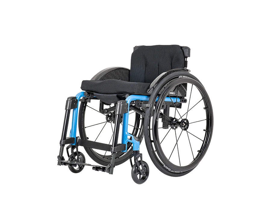 Unikat na rynku: Pierwszy i jedyny na świecie składany wózek inwalidzki z koncepcją otwartej ramy (mono-tube) z uchylnymi i zdejmowanymi podnóżkami.