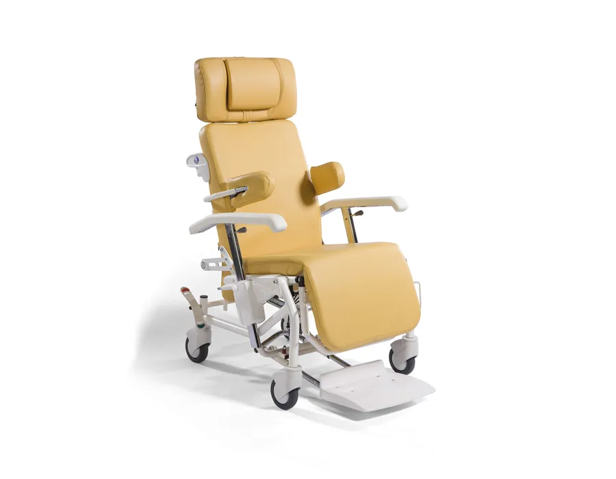 Wózek wyposażony jest w koła o średnicy 125 mm, które zapewniają dobrą zwrotność i ułatwiają manewrowanie. Po odchyleniu oparcia głowa pacjenta znajduje się w niskiej pozycji, co umożliwia wygodne wykonywanie czynności pielęgnacyjnych, takich jak mycie włosów.